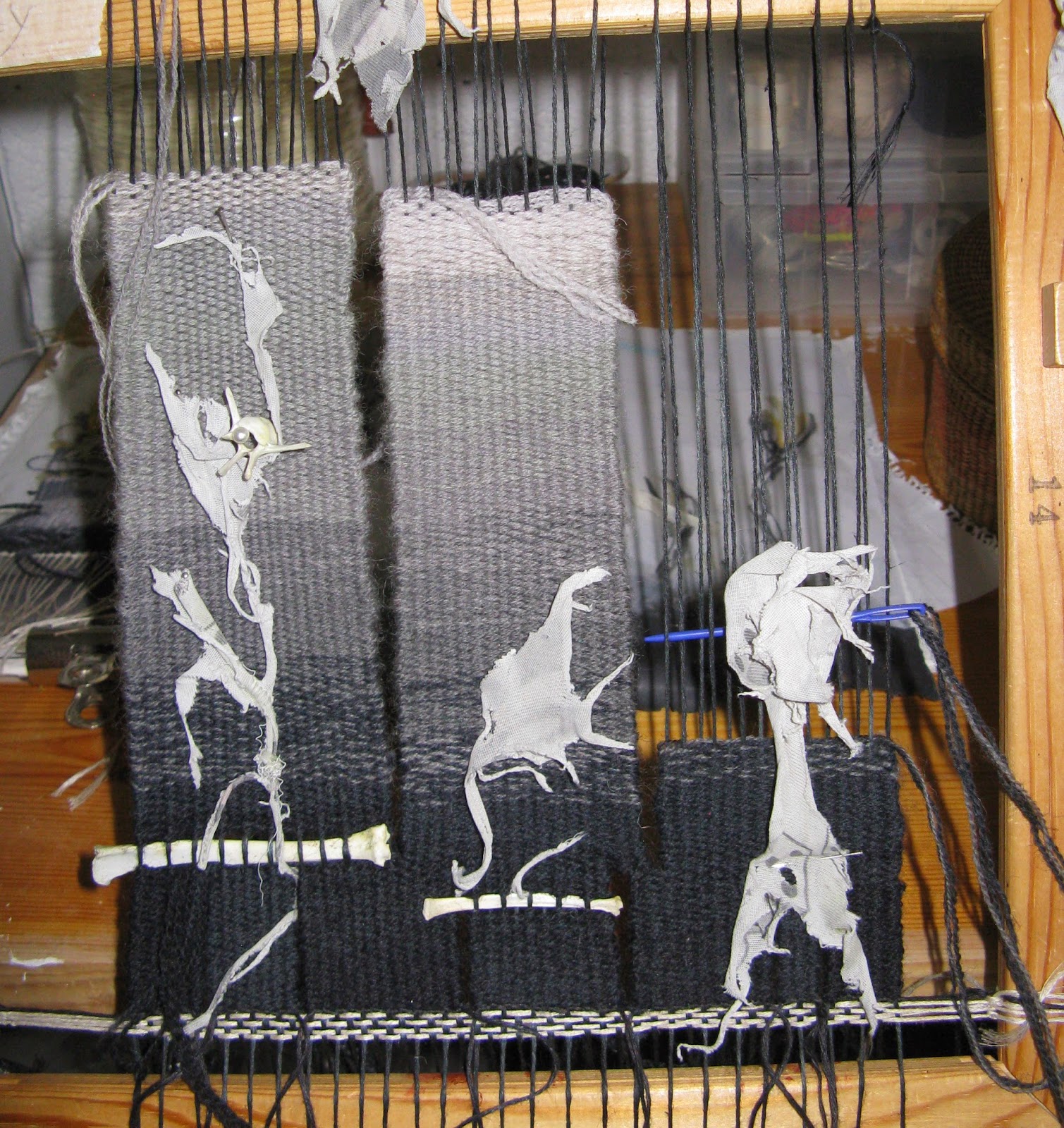 Trying my hand at machine embroidery, I'm hoping to create some backgrounds for the woven bundles, brooding black gulls overshadowing the pretty flowers.